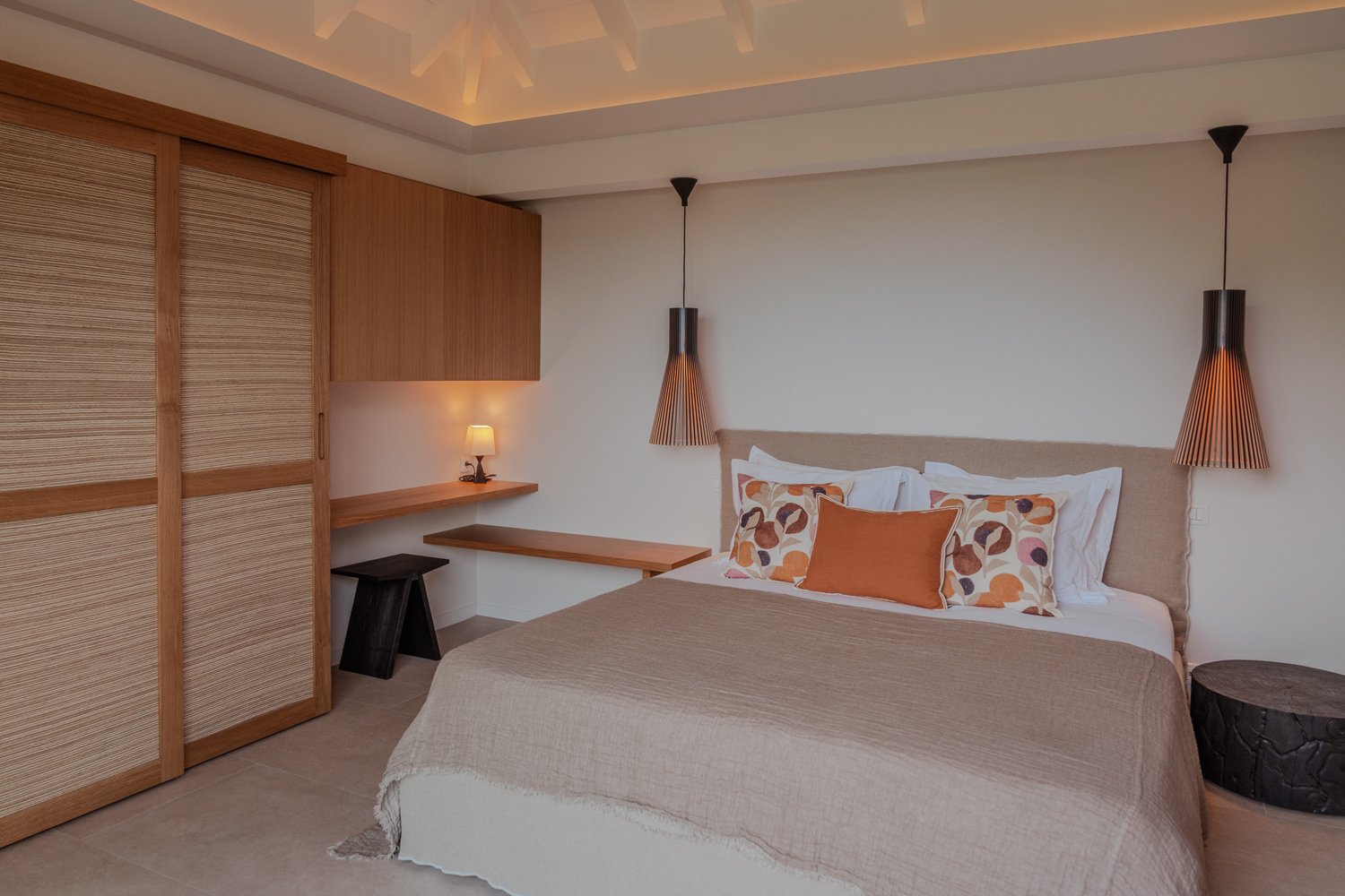 King size bed (180 cm), air-conditioning, ceiling fan, sea view, adjacent bathroom with shower and toilet, Smart TV, Dish network, safe